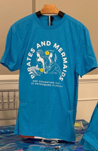All shirts are 100 % cotton, turquoise, scoop neck T-shirts imprinted with the 2027 Convention Logo.